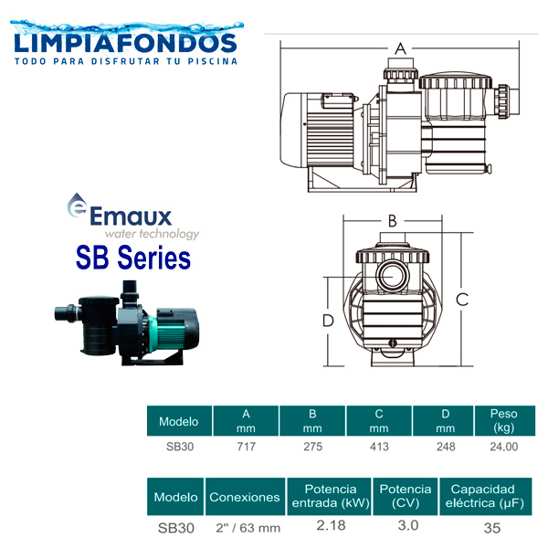 Se recomienda usar esta bomba en piscinas residenciales de hasta 200 m3. Usar con filtros con diámetro mayor a 90 cm. Cuenta con aspiración e impulsión en 2,0″.