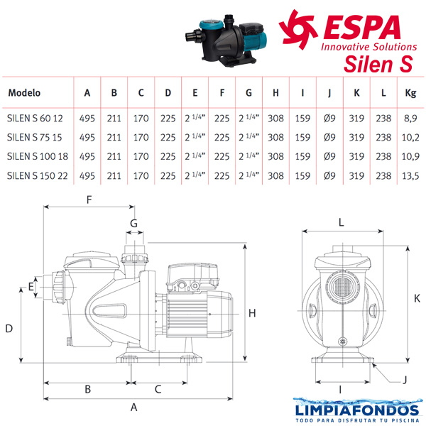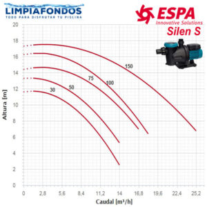 ESPA Silen S 150 – 1,5 HP. Usar con filtros de entre 70 y 80 cm de diámetro, Para piscinas residenciales grandes, de hasta 100.000 lts. Sus rangos óptimos de operación se encuentran entre los 12 y los 20 m3/hr con entre 15 y 11 mca.