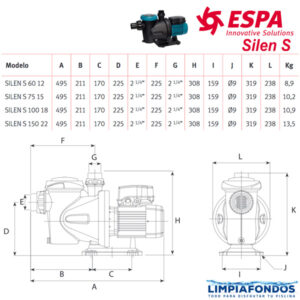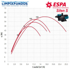 ESPA Silen S 100 – 1,0 HP. Usar con filtros de entre 60 y 70 cm de diámetro, Para piscinas residenciales grandes, de hasta 80.000 lts. Sus rangos óptimos de operación se encuentran entre los 8 y los 14 m3/hr con entre 15 y 11 mca.