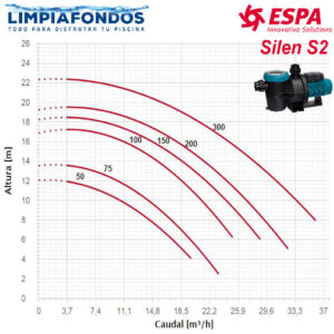 – Espa Silen S2 3,0 HP Trifásica: Piscina comercial de hasta 175 m3. Caudal máximo de 36 m3/hr y un máximo de 22 mca: Máxima eficiencia caudal de 22 m3/hr y 17 mca. Rangos óptimos operación entre los 15 y los 29 m3/hr con entre 20 y 13 mca.