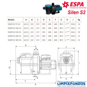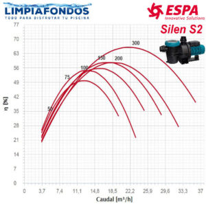 – Espa Silen S2 2,0 HP Trifásica: Piscina comercial de hasta 150 m3. Caudal máximo de 32 m3/hr y un máximo de 21 mca: Máxima eficiencia caudal de 19 m3/hr y 16 mca. Rangos óptimos operación entre los 11 y los 25 m3/hr con entre 18 y 11 mca.
