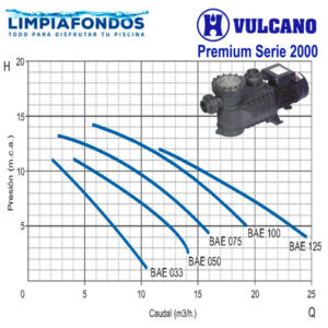 Vulcano Premium – 1,0 HP: Usar con filtros de entre 60 y 70 cm de diámetro. Para piscinas residenciales grandes, de hasta 100.000 lts. Sus rangos óptimos de operación se encuentran entre los 11 y los 15 m3/hr con entre 12 y 9 mca.