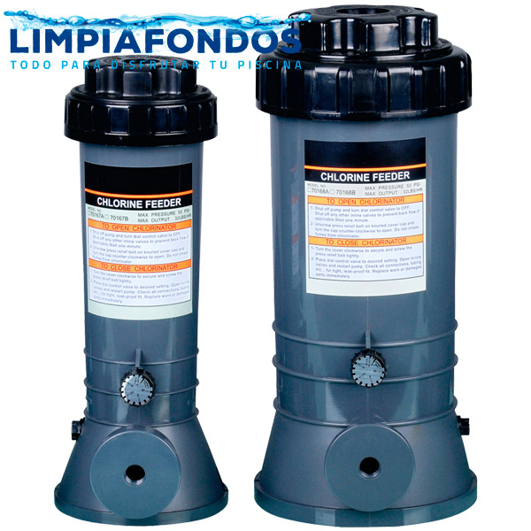 Cloradores Fuera de Linea para piscinas residenciales para usar con tabletas de cloro de 3″ de 200 grs, de lenta disolución. Con válvula dosificadora de control de flujo para ajuste fino para dosificar la cantidad de cloro.