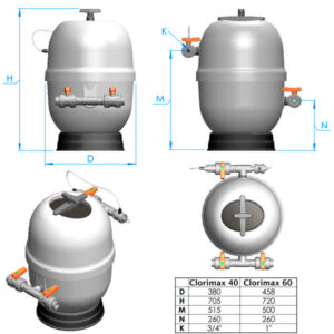 – Clorimax 60 Lt: Hasta 1000 m3. Altura 72 cm y diámetro de 46 cm. Válvulas 1″