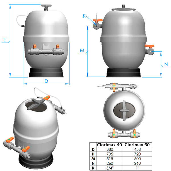 – Clorimax 40 Lt: Hasta 500 m3. Atura de 71 cm y diámetro de 38 cm. Válvulas 3/4″