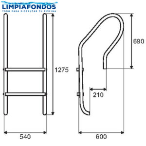 – Confort 2 Peldaños Acero: 128 cm de longitud. Instalar en un sector lateral donde la profundidad varíe entre los 0,7 a 0,8 mts.
