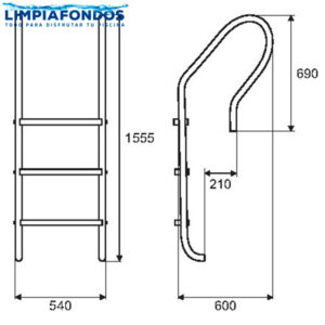 – Confort 3 Peldaños Acero: 156 cm de longitud. Instalar en un sector lateral donde la profundidad varíe entre los 1,0 a 1,1 mts.