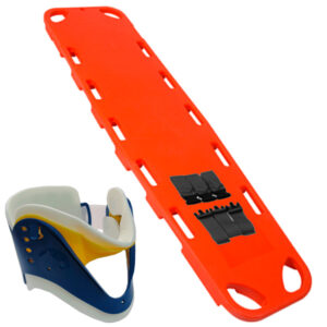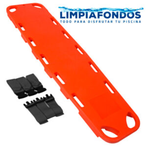 – 1 Camilla portátil o Tabla espinal, plástica, de color naranja, con capacidad de flotación con 3 correas de amarre.