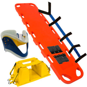 – 1 Camilla portátil o Tabla espinal, plástica, de color naranja, con capacidad de flotación con 3 correas de amarre.