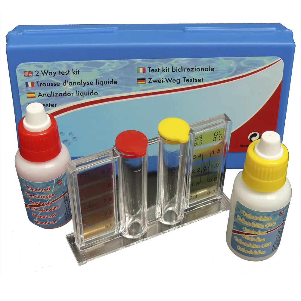 - Test de 2 parámetros (cloro y pH)Herramienta sencilla, rápida y muy útil para verificar la calidad del agua y mantenerla dentro de los niveles recomendados.