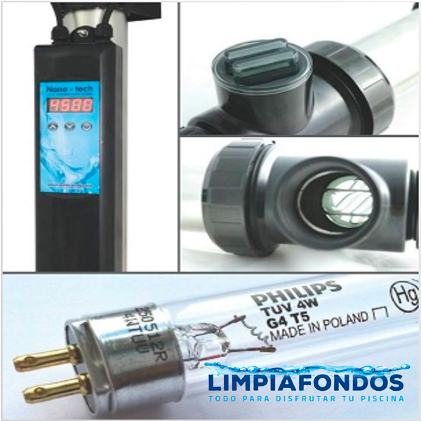 – Nano-Tech UV-C Temporizador 75W: Caudal máximo 25 m3/hr, volumen máximo 75 m3. Lámpara UV-C 75W y presión máxima 3 bares.