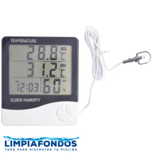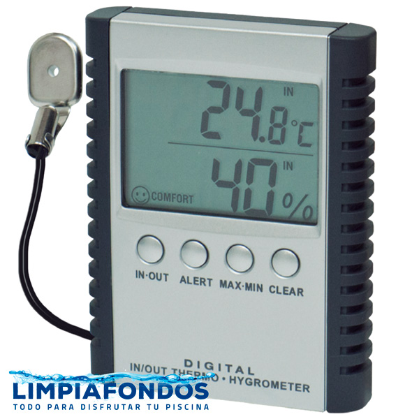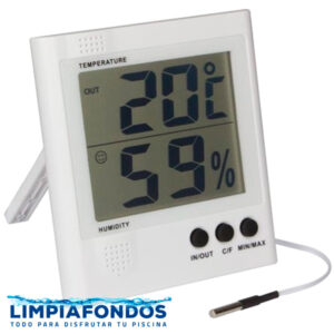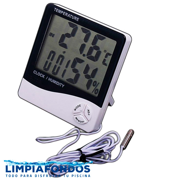 Termómetro e Higrómetro digital, para medir los parámetros ambientales. Cuenta con un cable externo para medir la temperatura exterior, o en un segundo lugar.