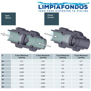 La diferencia de presión entre dos puntos de la instalación es capaz de vencer la resistencia del resorte, discurriendo así el fluido en el sentido previsto e impidiéndose el paso en sentido contrario.