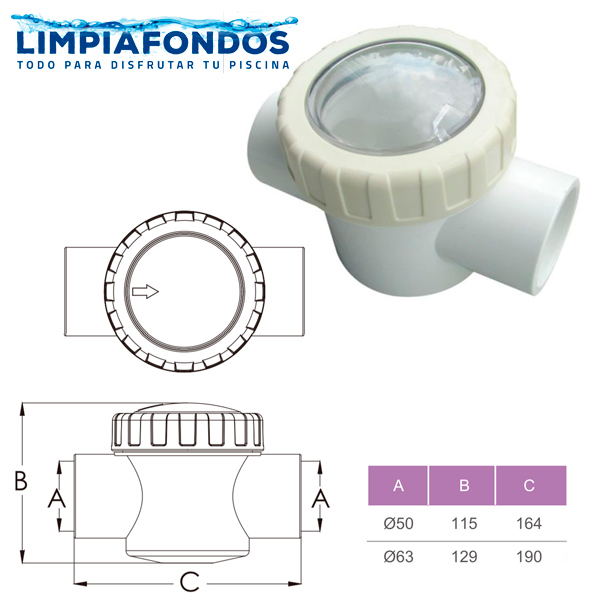 Válvula Anti Retorno o Check construida en ABS y PVC, con tapa transparente para poder ver el paso del flujo. Cuenta con una compuerta que impide el retorno del agua.